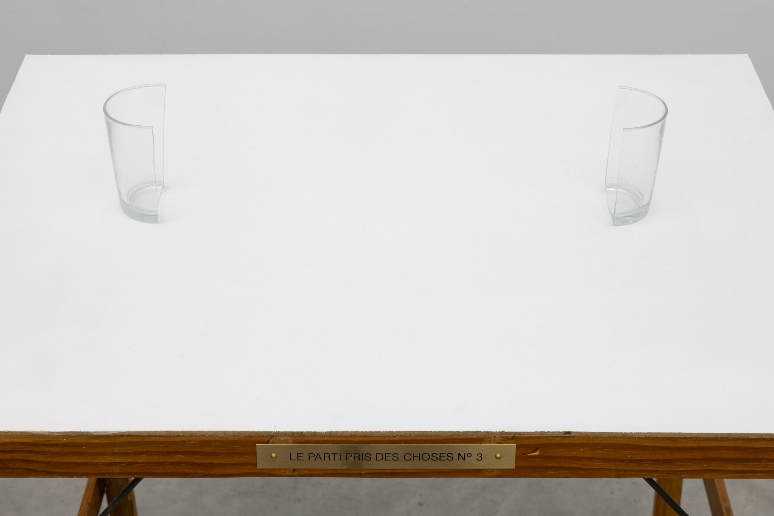 Le parti pris des choses N°3 Le parti pris des choses N°3. Drypoint on chemical carbon paper on wood, acrylic plaster and glass . Variable dimensions (table: 64.5 x 69.5 x 70 cm) « Le parti pris des choses N°2 » Le parti pris des choses N°4