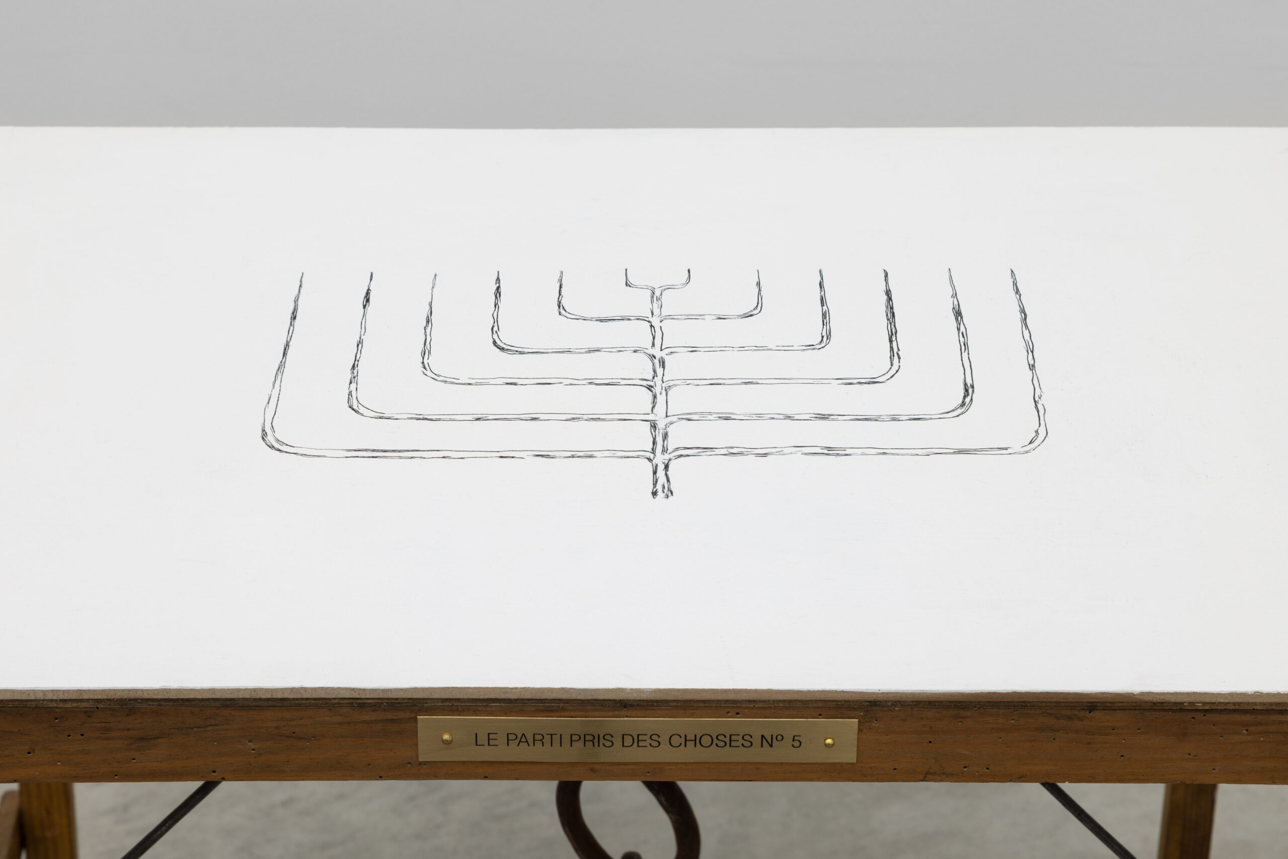 Le parti pris des choses N°5 Le parti pris des choses N°5. 2025 Drypoint on chemical carbon paper on wooden surface, acrylic plaster and iron slat. Variable dimensions (table: 64.5 x 69.5 x 50 cm; iron slat: 36 x 26 cm) « Le parti pris des choses N°4 » Le parti pris des choses N°6